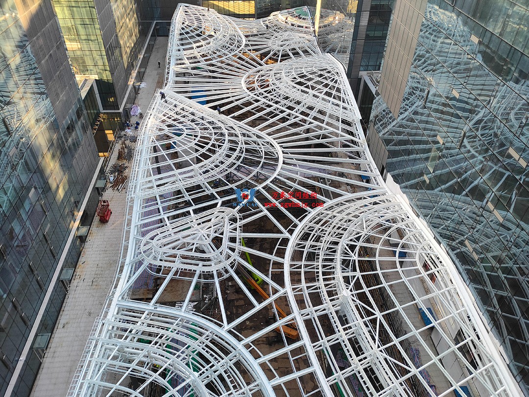 攻坚克难,技术破题。博多森谷园区中庭做的以茶山为主题的天幕,拥有茶山特有的山峰山谷,层层叠加,错落有致,山谷延绵弯曲,犹如江南河道水乡。博多森谷天幕造型特别复杂,钢结构跨度大,桁架各点标高不一,且节点构造复杂,截面形式多样,结构安装面积大,施工作业面广,整体呈曲面布置,钢结构桁架的安装对接均在高空进行,安装精度要求高,在钢膜结构行业内,属于特别复杂的项目。